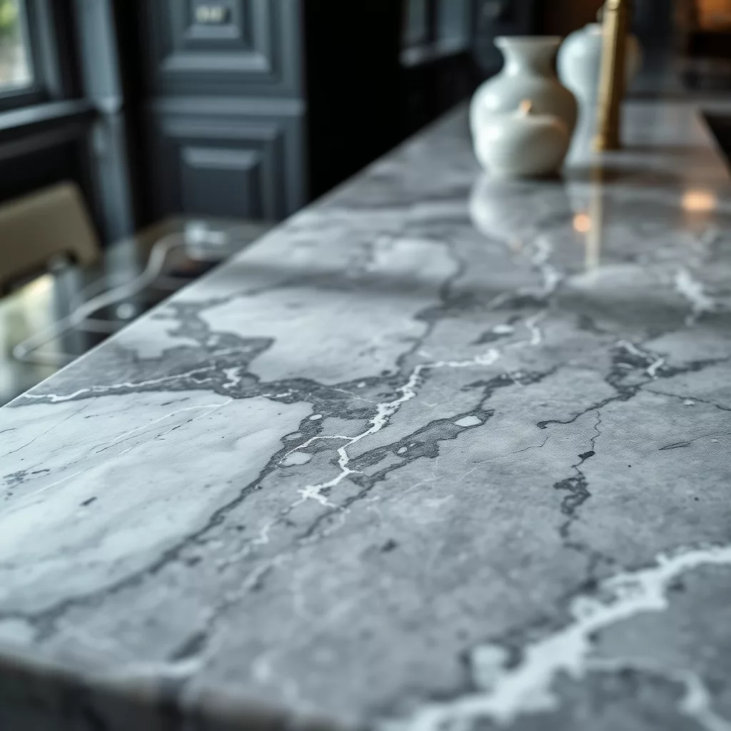 Close-up detail of luxurious marble worktop veining in a high-end kitchen by Marmoris Design London.