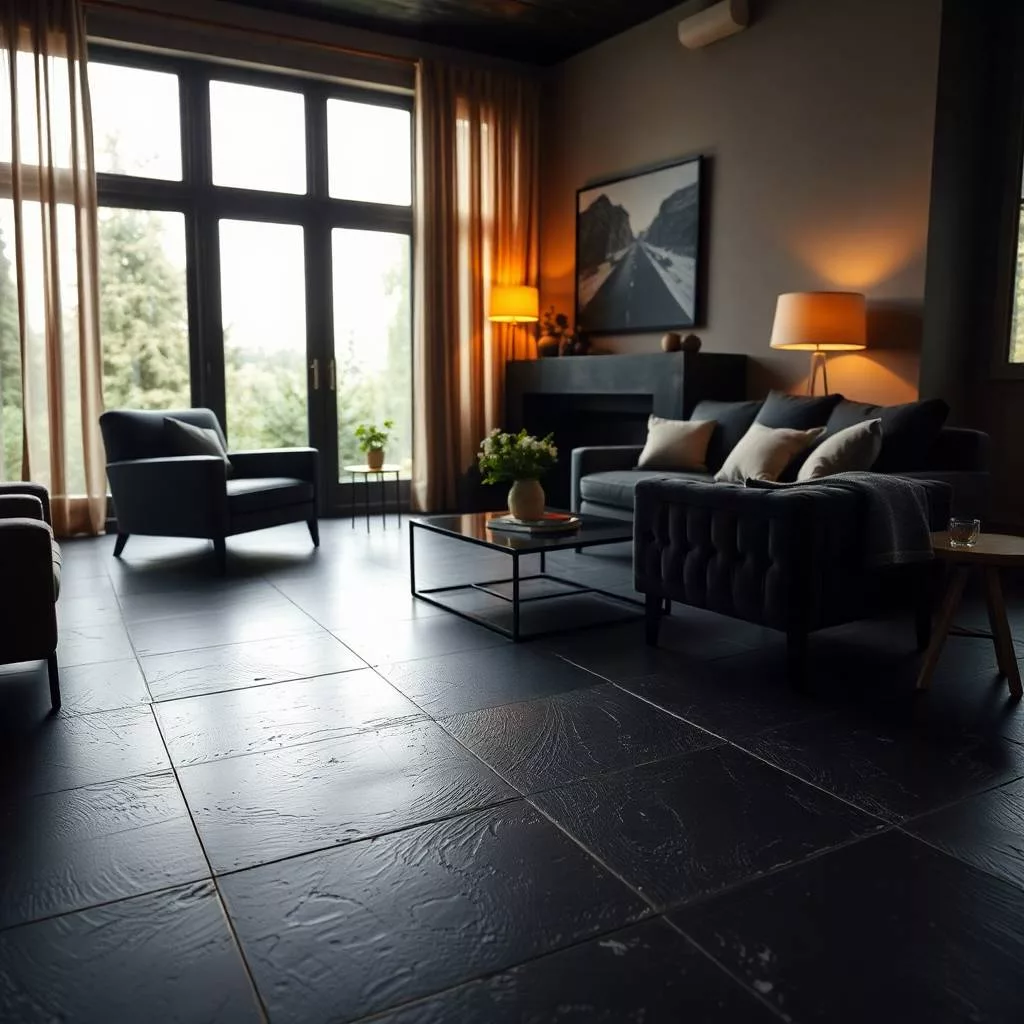 Dark slate flooring in a modern living area installed by Marmoris Design London.